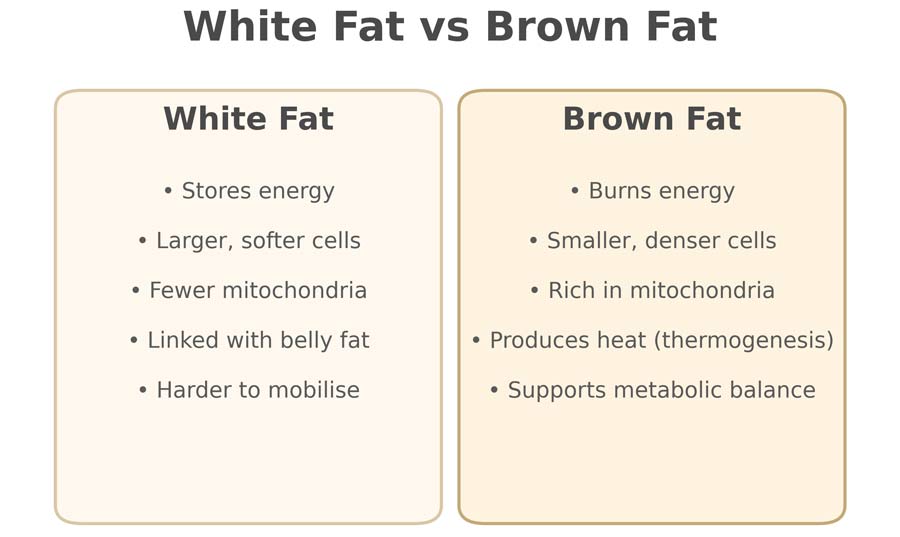 White fat is the type most associated with weight gain, belly fat and energy storage. These fat cells expand when we eat more than we burn and contract when the body mobilises stored energy. They play a role in hormone signalling and immunity, but too much white fat, especially around the abdomen, is strongly linked with inflammation, poor metabolic flexibility, reduced energy and cardiovascular concerns.